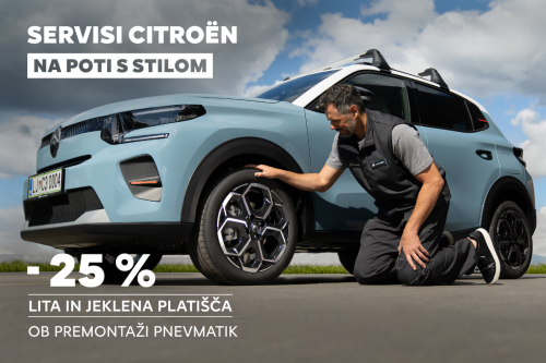 1Ponudba velja ob premontaži pnevmatik v Avtotehni VIS. Popust v višini 25 % se nanaša na nakup jeklenih ali litih platišč iz nabora originalne dodatne opreme, ki so na dan nakupa dobavljiva v pooblaščeni servisni mreži Citroën. Ponudba je veljavna med 20. 10. in 30. 11. 2025 oziroma do razprodaje zalog. Navedeni popust velja za original jeklena in lita platišča za vozila znamke Citroën (marketinška skupina 516, 517, 526). Ponudba velja za člane kluba My Citroën Plus in je na voljo pri pooblaščenem serviserju Avtotehna VIS. Slika je simbolične narave. Pridružujemo si pravico do morebitnih sprememb in napak v ponudbi.