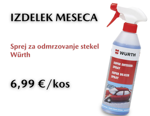 *Kataloška številka izdelka meseca sprej za odmrzovanje stekel Würth je W0892331201. Cena izdelka vključuje DDV in velja od 1.12.2025 do 28.02.2025 oz. do razprodaje zalog. Pred koriščenjem ponudbe vam svetujemo, da preverite razpoložljivost izdelkov. Pridržujemo si pravico do morebitnih sprememb in napak v ponudbi. Slika izdelka je simbolična.