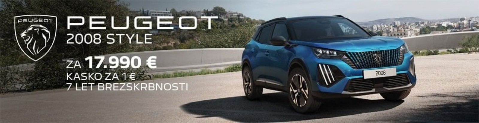 2 Primer informativnega izračuna finančnega lizinga Peugeot Financiranje za vozilo Peugeot 2008 Style hibrid - mesečno odplačevanje; maloprodajna cena z DDV in vključenim bonusom (v ceni je obračunanih 1.500 € popusta v primeru financiranja Peugeot - pod pogojem vsaj 36 mesečne dobe financiranja) je 19.990 €; mesečni obrok je 199 € pri pologu v višini 6.550 € in ročnostjo 96 mesecev; višina pologa je pri akciji omejena od 10 % do 50 %, doba financiranja je vezana na ročnost od 36 mesecev do 96 mesecev; DDV je obračunan v obrokih; EOM na dan 14.1.2026 znaša 9,7 % in se spremeni, če se spremenijo elementi izračuna; izračun temelji na osnovi fiksne obrestne mere s skupno letno obrestno mero 8,9 %; financirana vrednost 13.440 €; skupni znesek za plačilo 25.466 €; stranka v primeru Peugeot Financiranja prejme tudi kasko zavarovanje za 1 € za prvo leto, kjer pa si Peugeot Financiranje pridružuje pravico do izbire zavarovalnice. Za podrobnosti o ponudbi se obrnite na prodajne svetovalce Peugeot v Avtotehni VIS.