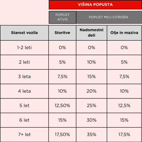 Glede na starost vašega vozila vam, skladno s tabelo,pripada popust ob obisku našega pooblaščenega Citroën servisa.